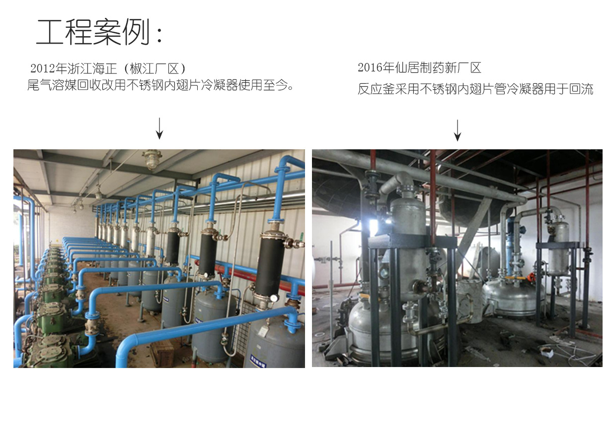 “冷凝王”不銹鋼內(nèi)翅片管冷凝器,具有體積小、重量輕、阻力小、換熱能力大、熱交換充分的優(yōu)點.廣泛應(yīng)用于氣液交換、混合氣體凝結(jié)、壓縮機氣體的后冷卻處理,氣體加熱等領(lǐng)域.氣體處理量從幾個立方到上千立方均可采用。該"冷凝王"材質(zhì)可制作304不銹鋼、316L不銹鋼、2205不銹鋼、純銅等,換熱面積從小于1平方到2000平方均可以做到??蓾M足不同領(lǐng)域的熱交換、蒸發(fā)、提純、尾氣回收。經(jīng)過多年來的上機運行證實,使用效果不錯、替換傳統(tǒng)的螺旋板換熱器、列管換熱器、板片式換熱器有明顯的優(yōu)勢,其占地面積小、重量輕、安裝檢修方便、物美價廉是突出的不可比擬的優(yōu)點。能使生產(chǎn)車間整潔、空間超大、視覺舒服。